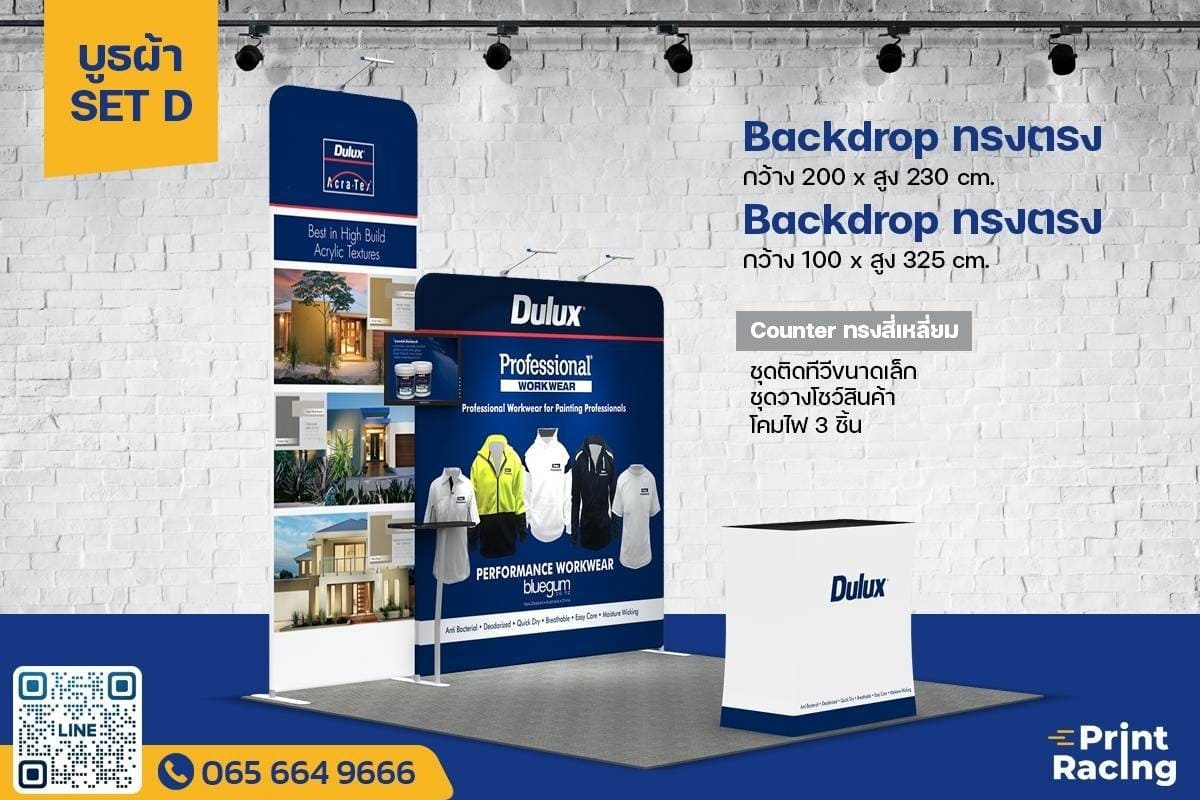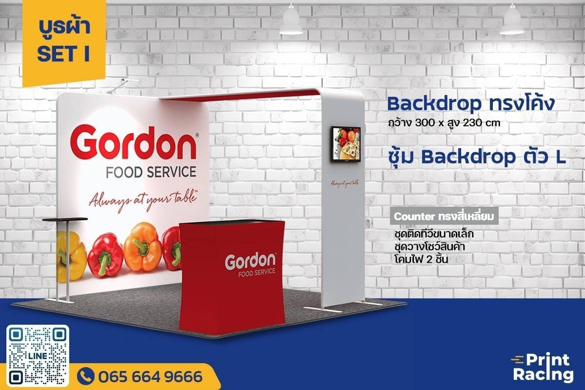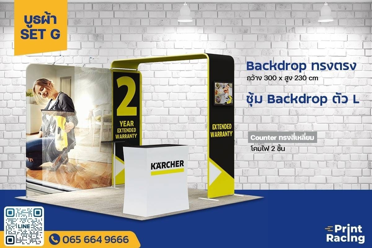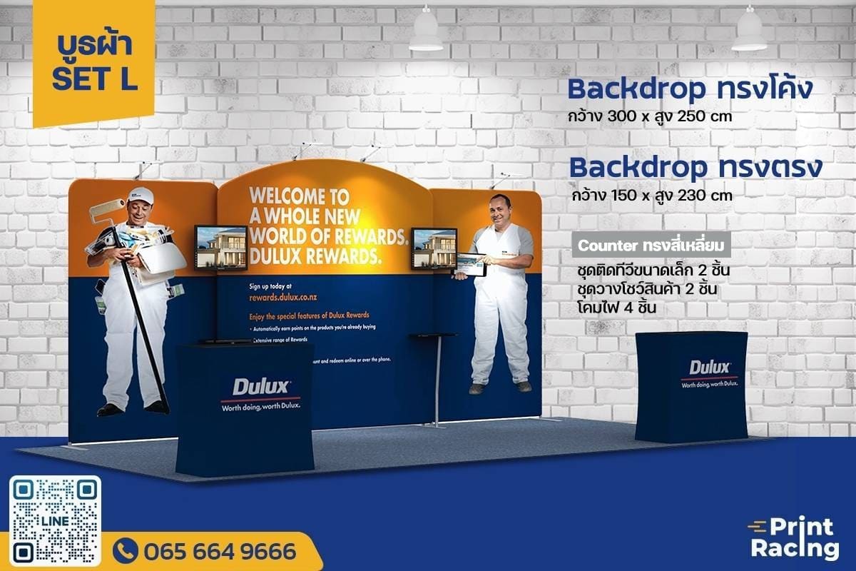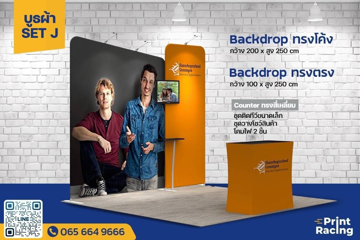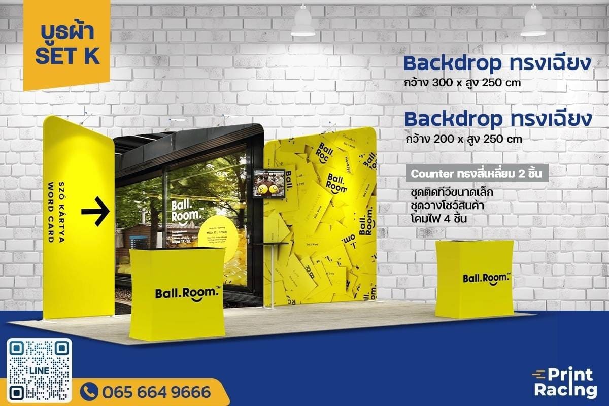 บูธสำเร็จรูป ที่ผลิตจากงานพิมพ์ผ้า และโครงอะลูมิเนียม เป็นอุปกรณ์ออกบูธที่สะดวกและมีประสิทธิภาพสำหรับการจัดแสดงสินค้า งานแสดงนิทรรศการ หรือกิจกรรมต่าง ๆ ที่ต้องการความรวดเร็วและง่ายในการติดตั้งและถอดเก็บ บูธผ้าเป็นหนึ่งในรูปแบบของบูธป๊อปอัพ (Pop-Up Booth ) มีโครงสร้างเบา สามารถพับเก็บได้ และติดตั้งง่าย ใช้เวลาติดตั้งน้อย เคลื่อนย้ายสะดวก และมักมีกราฟิกที่เปลี่ยนได้ง่าย เหมาะสำหรับงานแสดงสินค้าขนาดเล็กถึงกลาง นิทรรศการ และงานประชุม