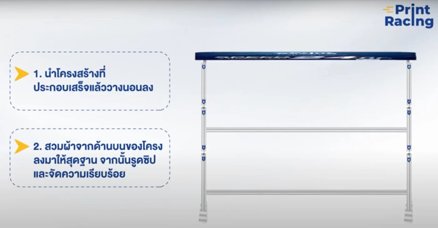 เมื่อต่อชิ้นส่วนทุกชิ้นเสร็จเรียบร้อย ให้ตรวจสอบจุดล็อกและข้อต่อต่าง ๆ ของโครงอะลูมิเนียมให้แน่นหนา อย่าลืมหมุนล็อกให้แน่นเพื่อความมั่นคงของโครง หากโครงแข็งแรงดีแล้วก็พร้อมสำหรับการติดตั้ง Backdrop ผ้าต่อไป
